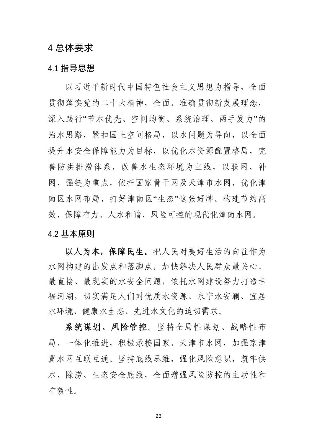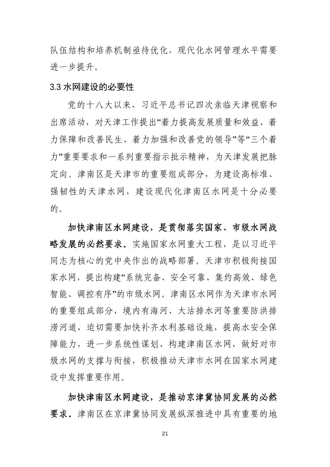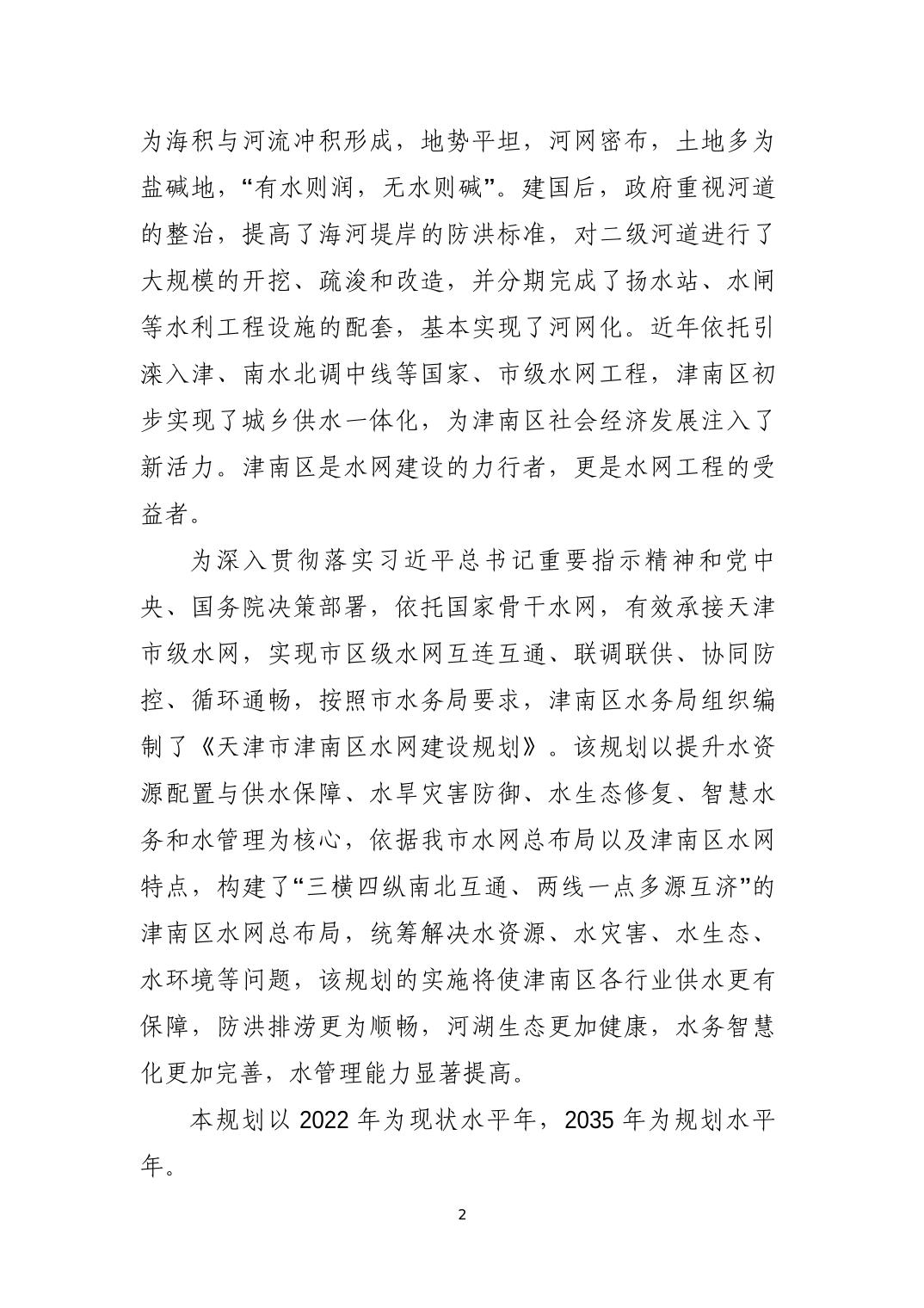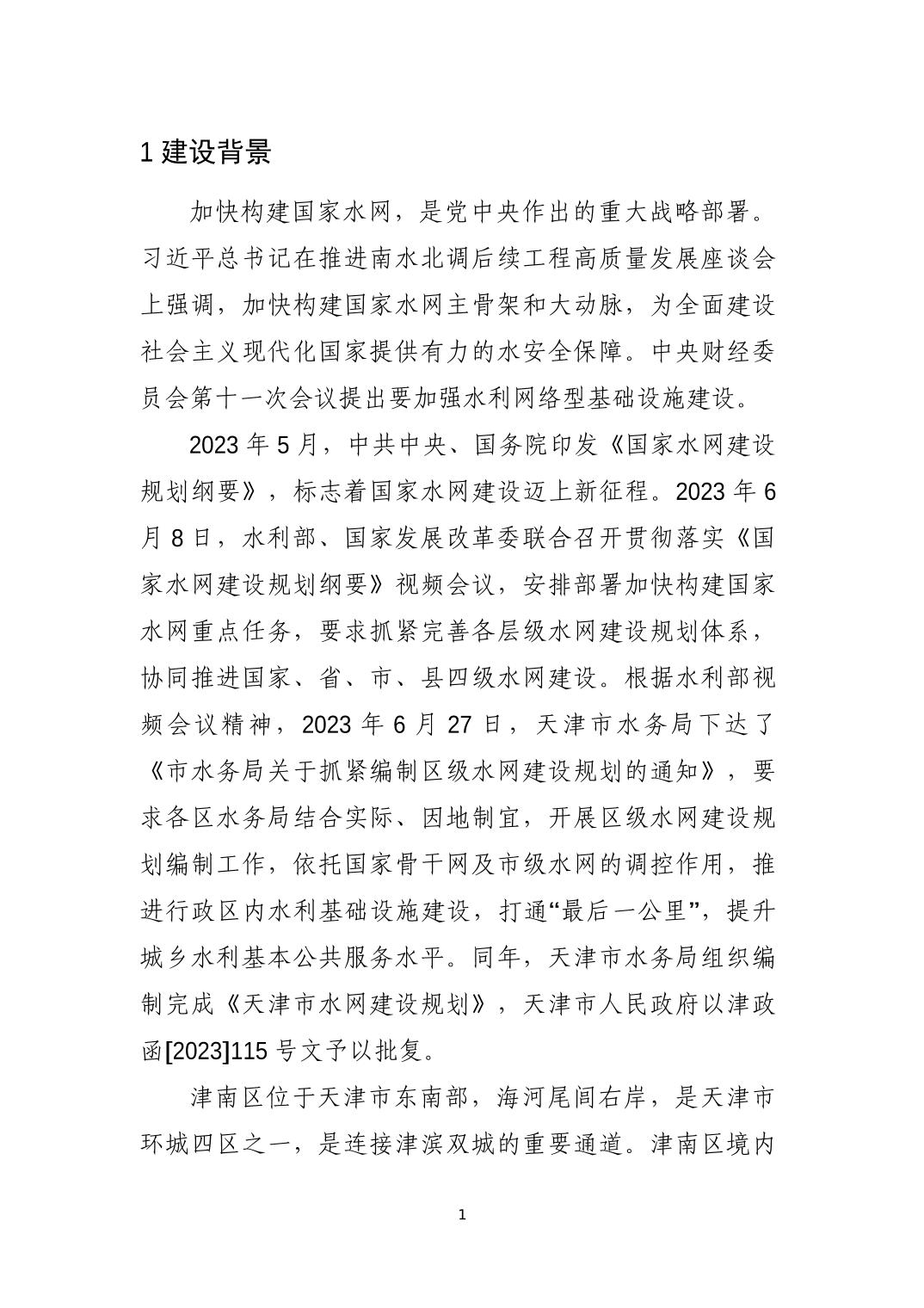2023年5月,中共中央、国务院印发《国家水网建设规划纲要》,标志着国家水网建设迈上新征程。2023年6月8日,水利部、国家发展改革委联合召开贯彻落实《国家水网建设规划纲要》视频会议,安排部署加快构建国家水网重点任务,要求抓紧完善各层级水网建设规划体系,协同推进国家、省、市、县四级水网建设。根据水利部视频会议精神,2023年6月27日,天津市水务局下达了《市水务局关于抓紧编制区级水网建设规划的通知》,要求各区水务局结合实际、因地制宜,开展区级水网建设规划编制工作,依托国家骨干网及市级水网的调控作用,推进行政区内水利基础设施建设,打通“最后一公里”,提升城乡水利基本公共服务水平。同年,天津市水务局组织编制完成《天津市水网建设规划》,天津市人民政府以津政函[2023]115号文予以批复。