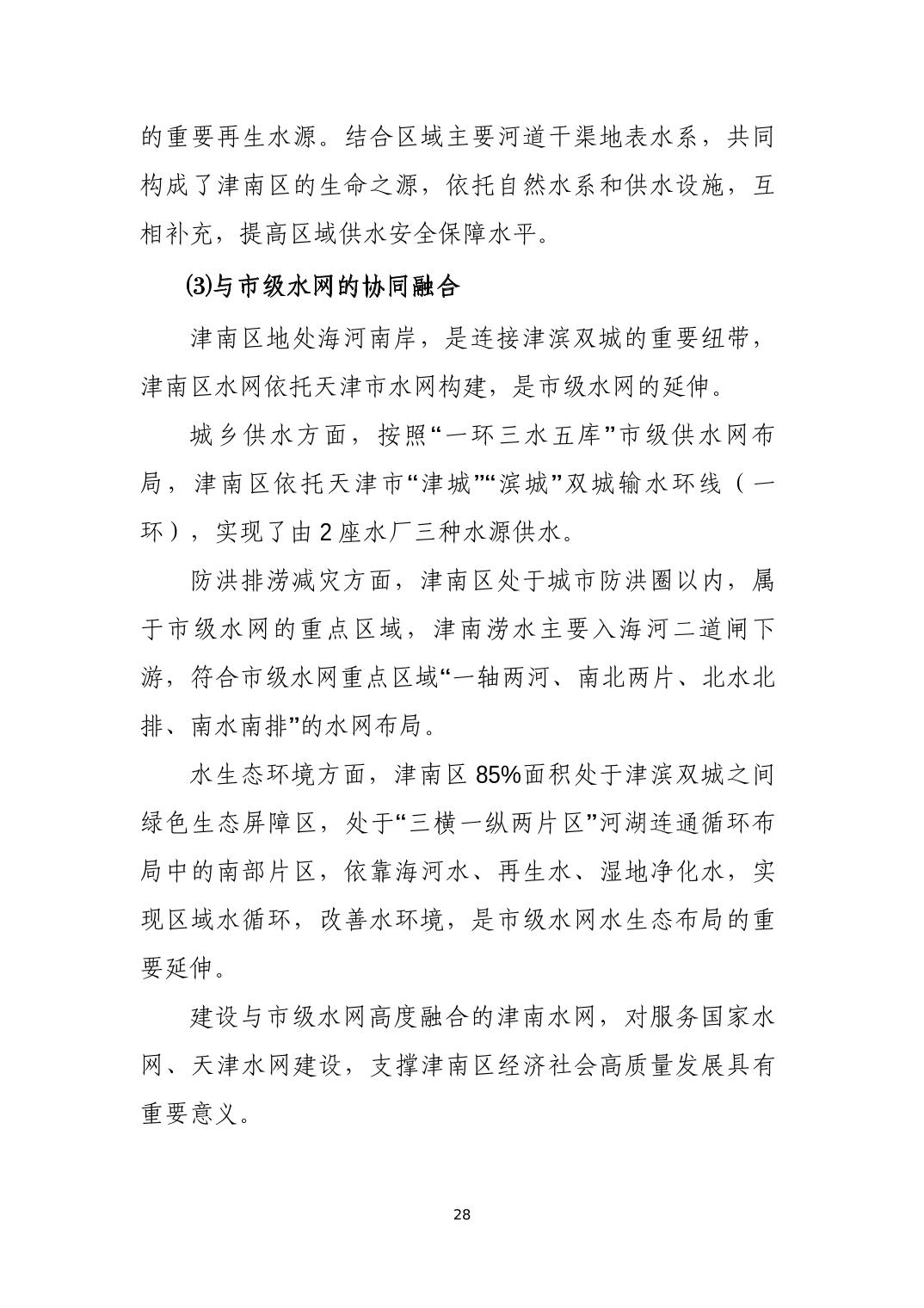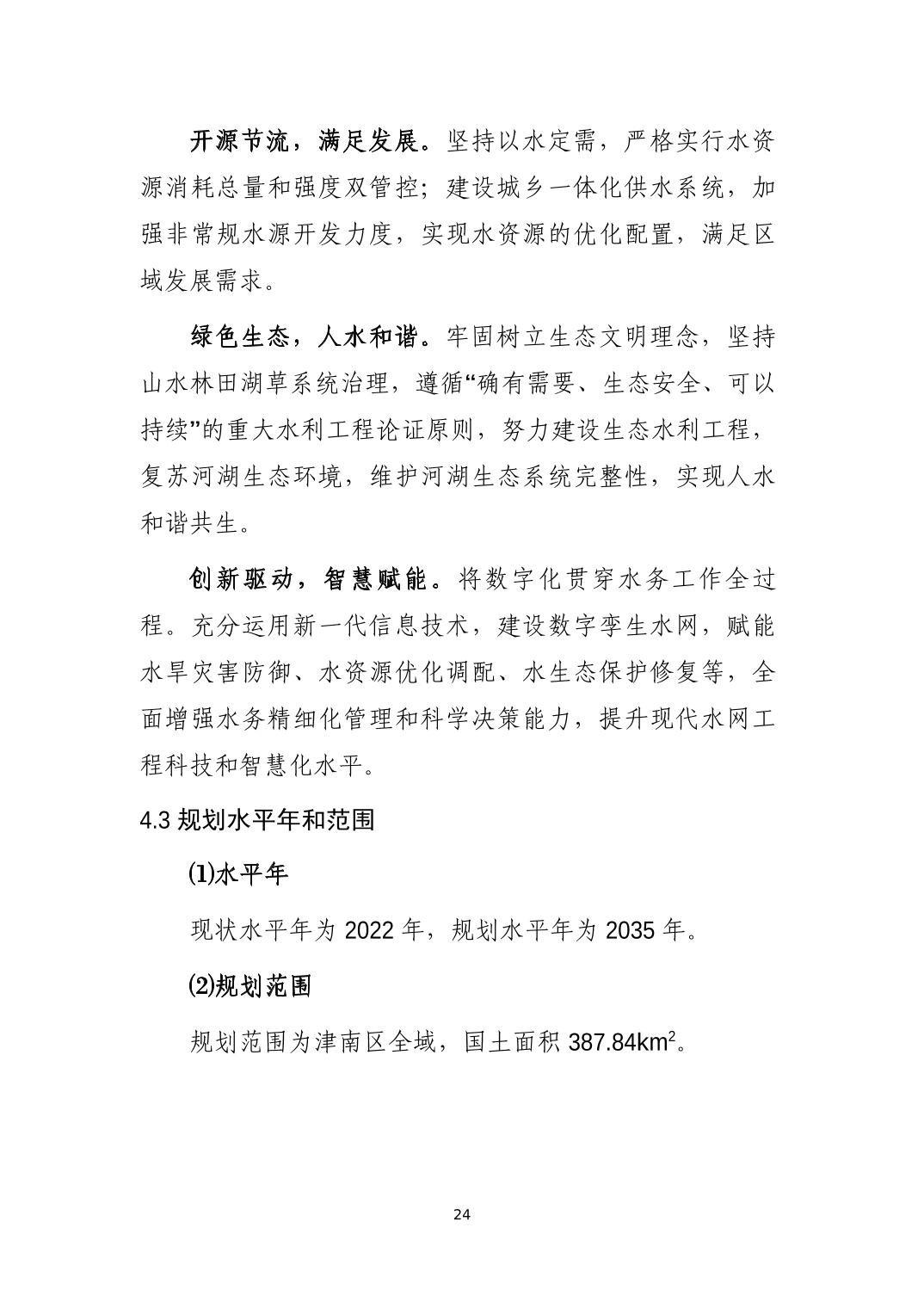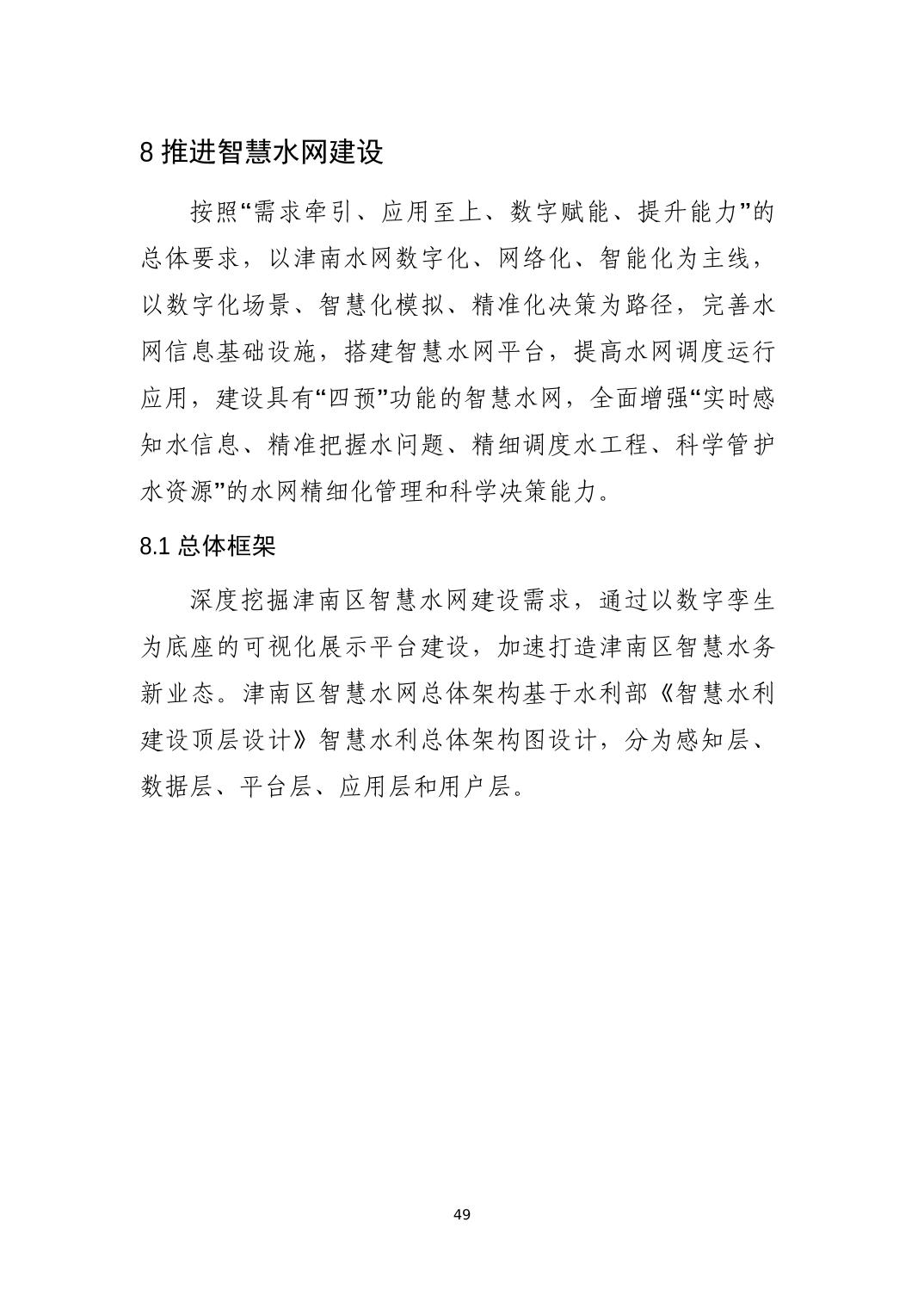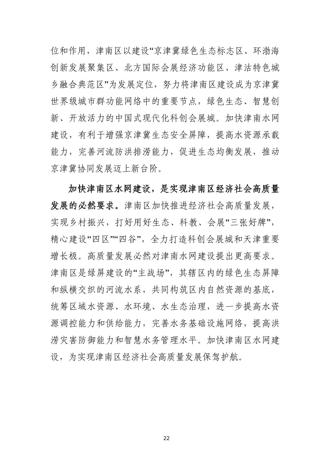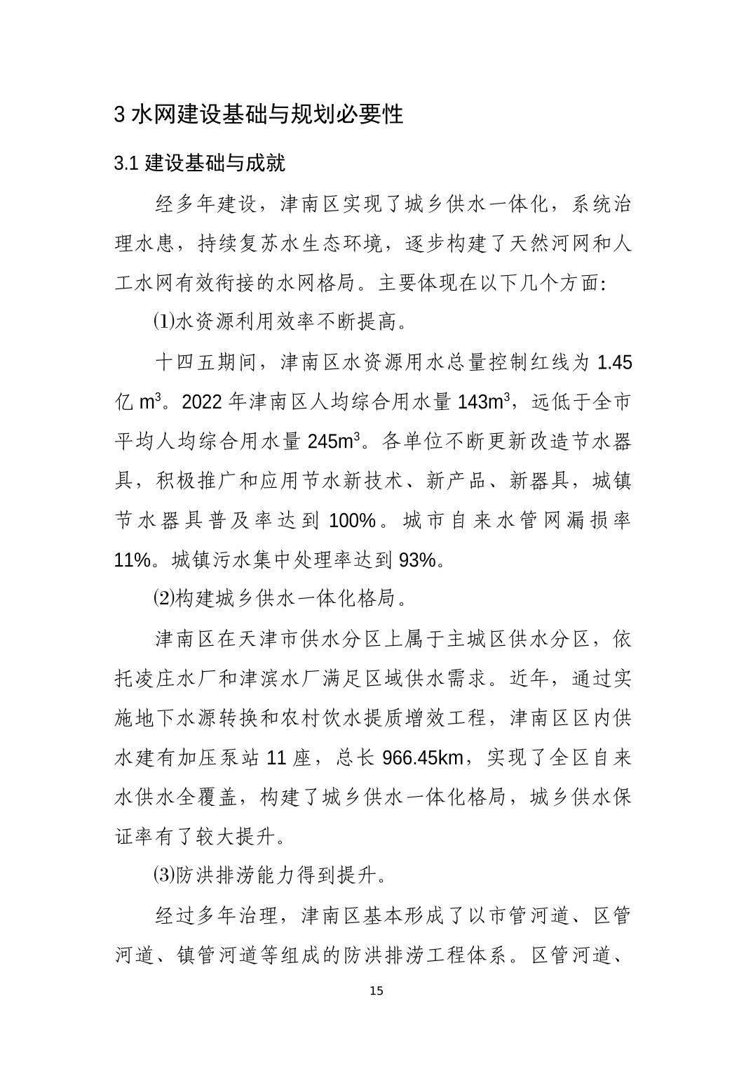 2023年5月,中共中央、国务院印发《国家水网建设规划纲要》,标志着国家水网建设迈上新征程。2023年6月8日,水利部、国家发展改革委联合召开贯彻落实《国家水网建设规划纲要》视频会议,安排部署加快构建国家水网重点任务,要求抓紧完善各层级水网建设规划体系,协同推进国家、省、市、县四级水网建设。根据水利部视频会议精神,2023年6月27日,天津市水务局下达了《市水务局关于抓紧编制区级水网建设规划的通知》,要求各区水务局结合实际、因地制宜,开展区级水网建设规划编制工作,依托国家骨干网及市级水网的调控作用,推进行政区内水利基础设施建设,打通“最后一公里”,提升城乡水利基本公共服务水平。同年,天津市水务局组织编制完成《天津市水网建设规划》,天津市人民政府以津政函[2023]115号文予以批复。