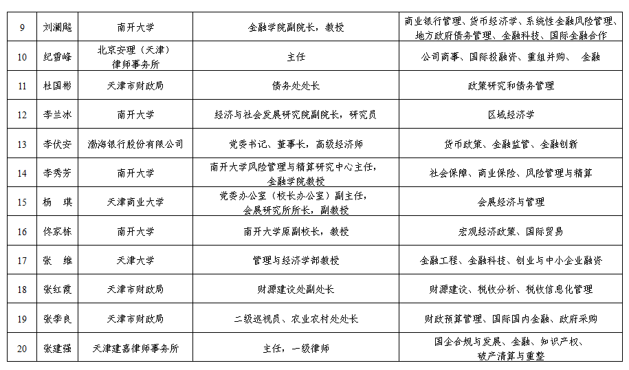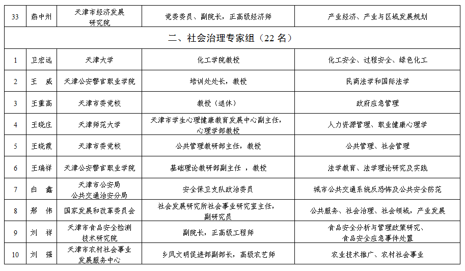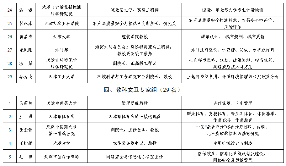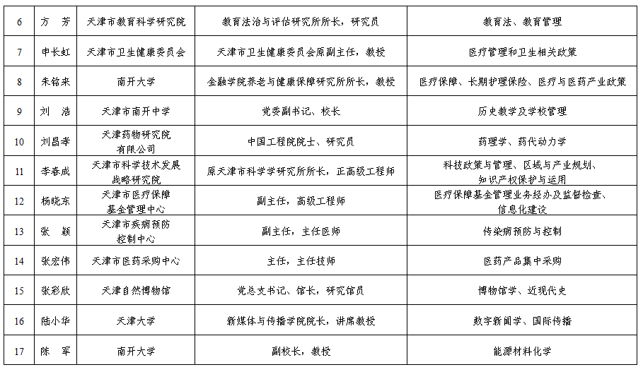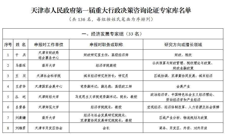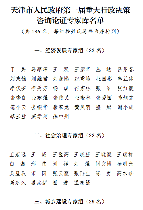 为充分发挥各领域专家在重大行政决策工作中的作用,进一步推进重大行政决策工作科学化、民主化、法治化,根据《重大行政决策程序暂行条例》和《天津市重大行政决策程序规定》等有关规定,市人民政府聘任于兵、马蔡琛等136人为天津市人民政府第一届重大行政决策咨询论证专家库专家,聘期五年。