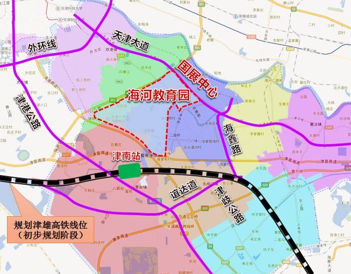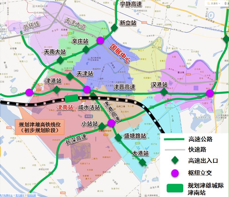 ①高快网络不足,难以实现大运量交通需求。2019年底通过的《京津冀核心区铁路枢纽总图规划》中,中长期规划项目包括规划的津雄城际铁路从津南南部地区穿过,如图1.2-2所示,高铁站周边高速出入口少,缺少与高快网的连通,无法实现高铁站带来的大运量交通的快速运转。