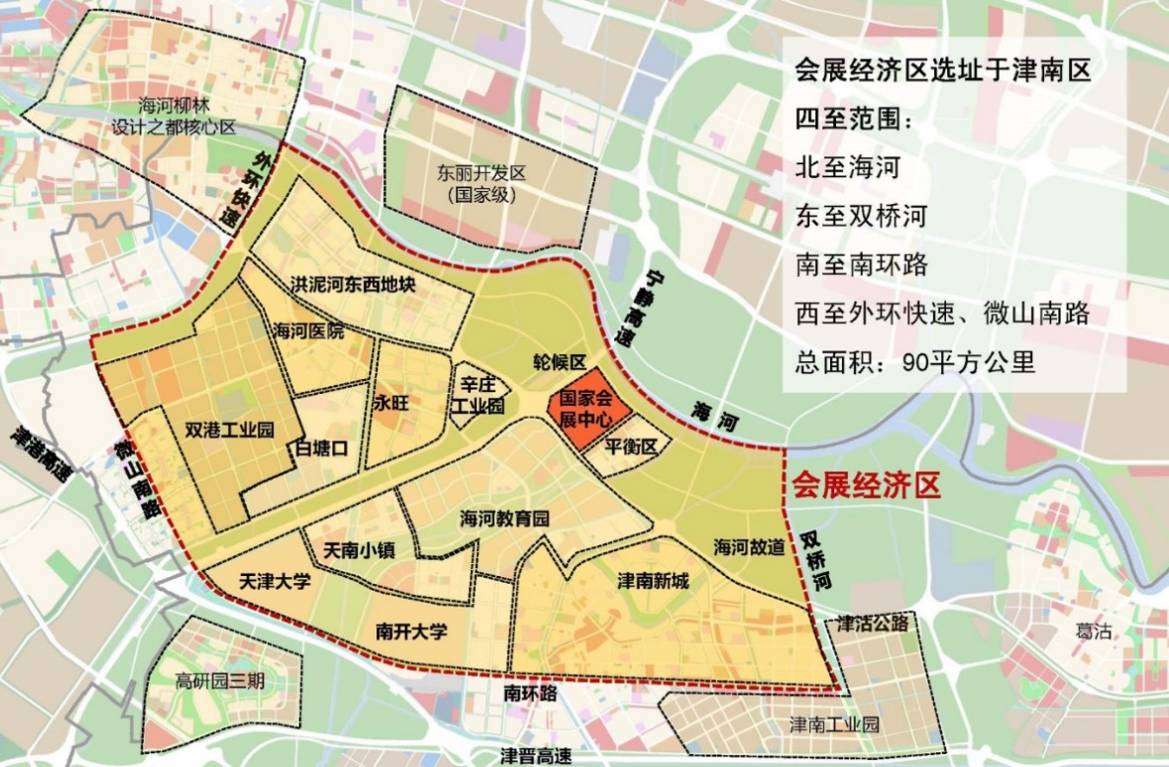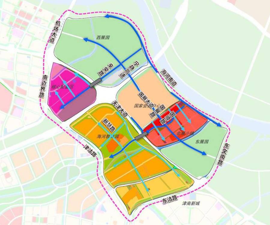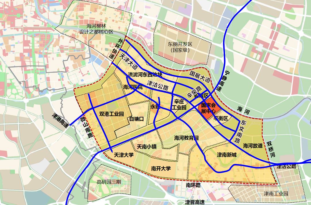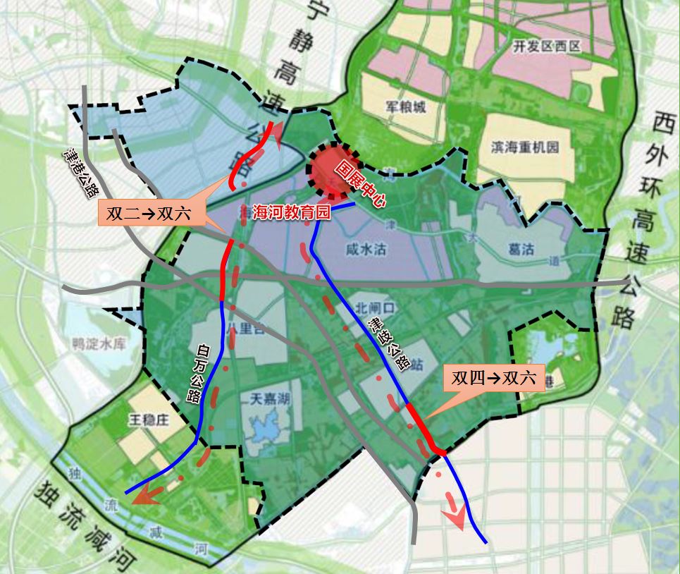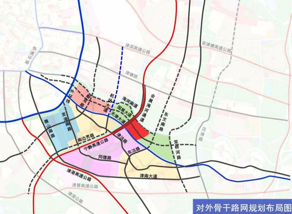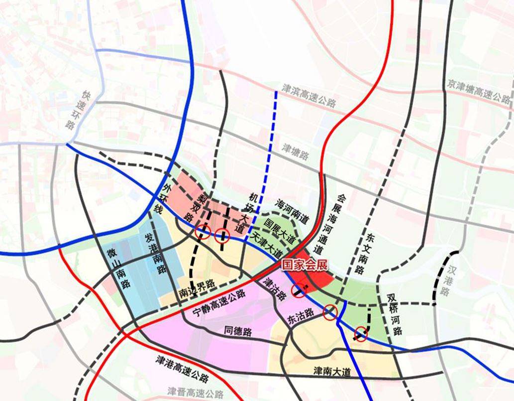 ③保证重点区域内外交通方面。规划建设海河南道西延(辛柴路-机场大道)、国展大道(华盛寺-葛沽外环)、新慧路桥(雅泽路-东沽路)等项目。