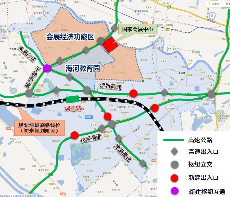 ①主动接入京津冀交通体系方面。开展津雄城际津南站、轨道交通津滨线、新增高速出入口等项目规划研究,规划建设谊达道(西青津南界-八里台东路)等项目。