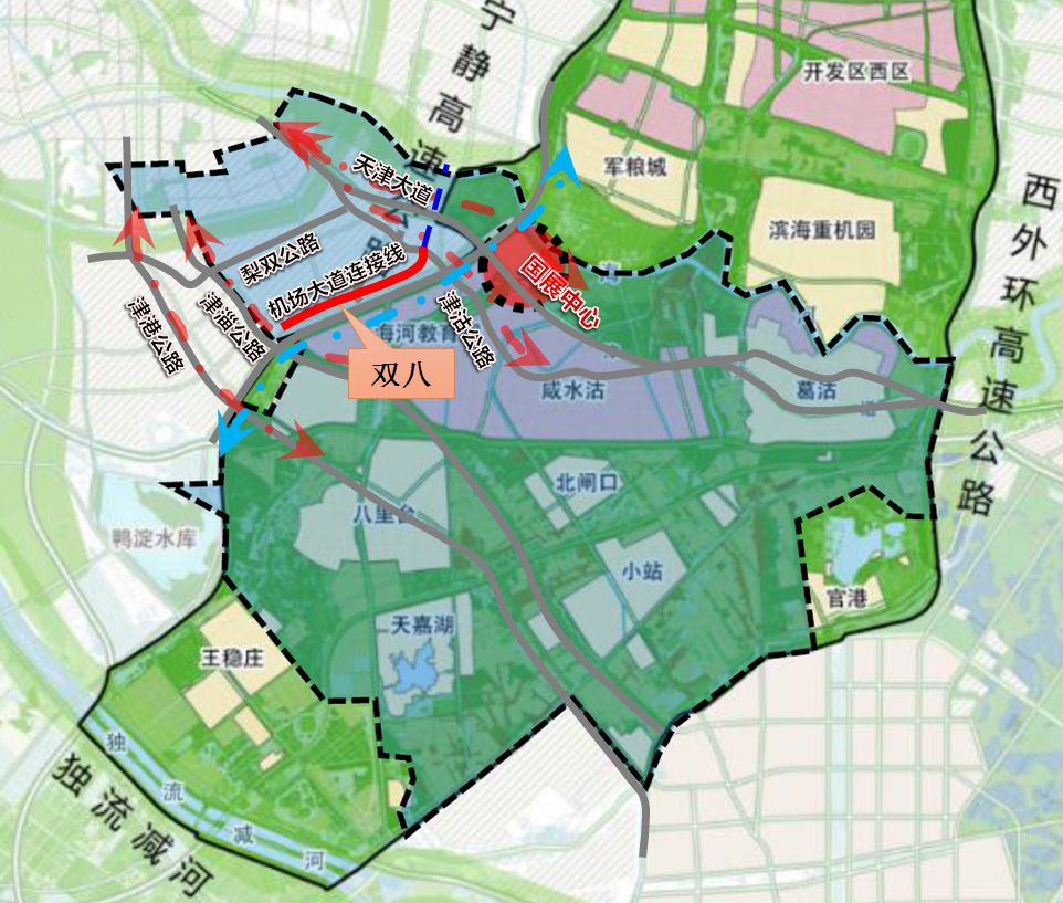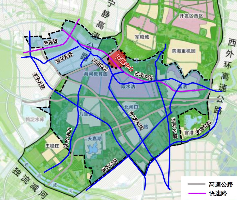 ⑥海河教育园区是创新发展聚集区的核心,与各产业片区之间运转主要通过二八公路、津沽公路、天津大道、津歧公路、津港公路实现,过于依赖二八公路、津歧公路。