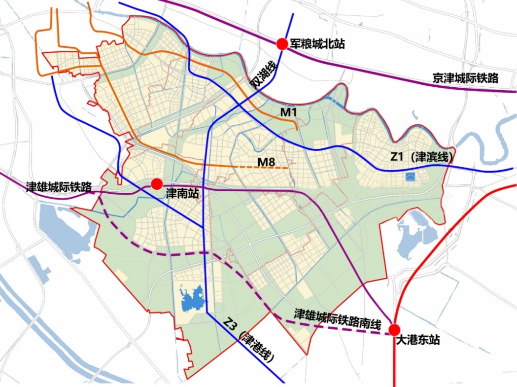 环城四区中东丽区有现状京津城际和军粮城北站,有正在规划设计的京滨城际和滨海机场站,西青区有现状京沪铁路和天津南站,北辰区有正在规划建设的京滨城际和北部新区站。在线赌场 作为环城四区之一,暂无明确的高速铁路建设计划,不利于区域发展以及会展功能的保障。“十四五”时期需开展津雄城际津南站、轨道交通津滨线以及轨道交通6号线东延至津南医院的规划研究,推动干线铁路、城际铁路、市域(郊)铁路、城市轨道交通“四网融合”。
