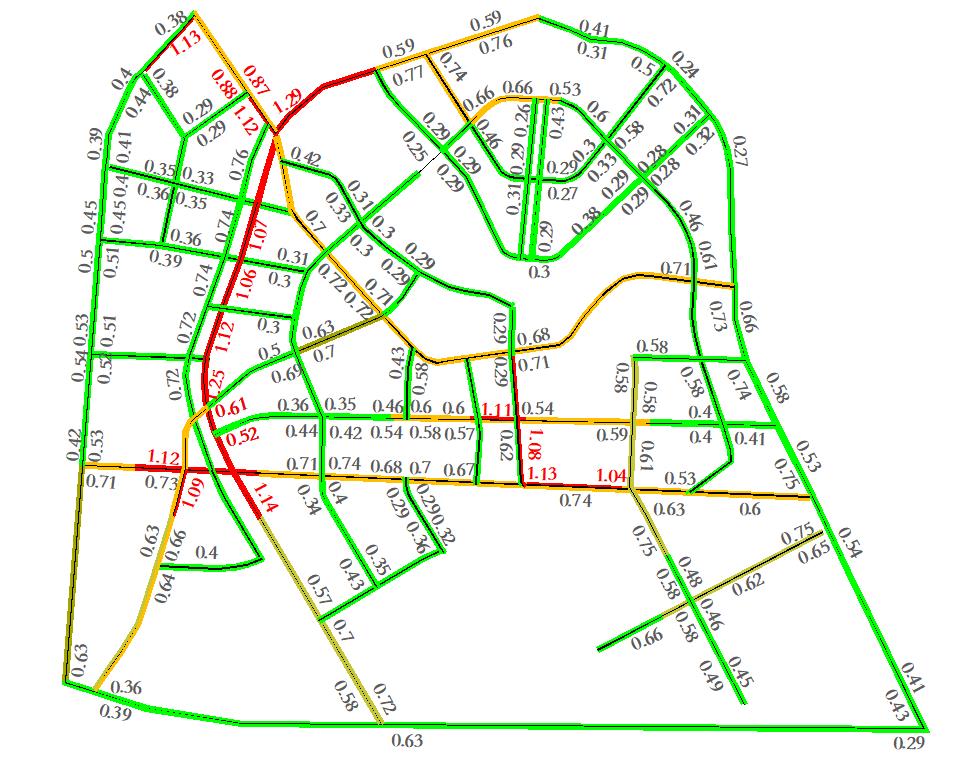 现状咸水沽核心区局部道路高峰小时道路路段负荷度>1,道路密度仅为4.24km/km²,存在拥堵情况,如图5.2-9所示。
