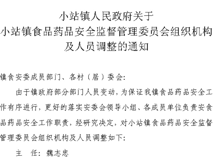 小站镇人民政府关于小站镇食品药品安全监督管理委员会组织机构及人员调整的通知