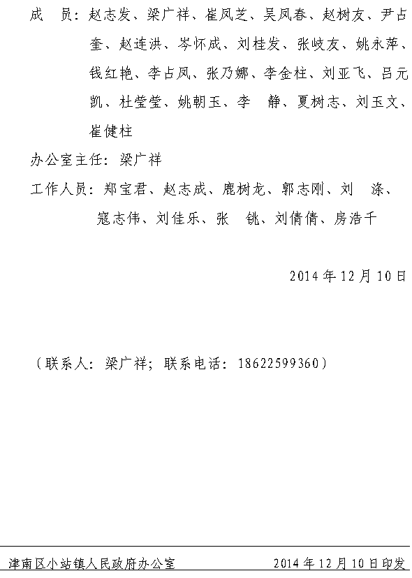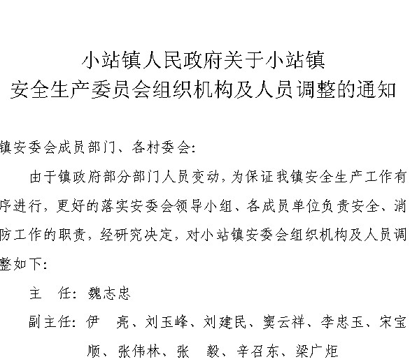 由于镇政府部分部门人员变动,为保证我镇安全生产工作有序进行,更好的落实安委会领导小组、各成员单位负责安全、消防工作的职责,经研究决定,对小站镇安委会组织机构及人员调整如下